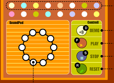 | マルの上にマウスを持っていく度に、音の高さと色が変化するヨ。 まずは適当にマウスをフラフラ動かしてみよう。 ゆっくり音を選びたい時は、マルの上でクリックしよう。 |